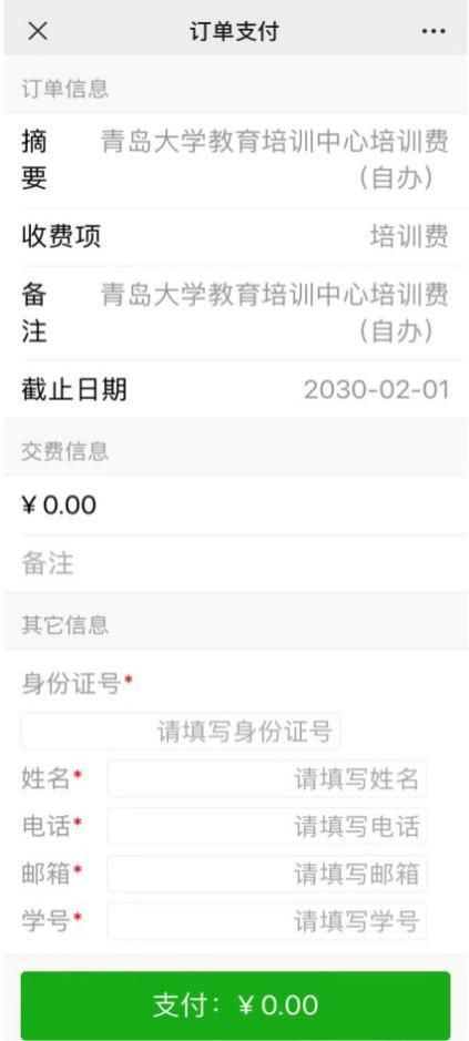 2.根据页面要求正确填写姓名、身份证号、联系电话、邮箱、学号(注意务必准确填写课程学号:20263009)、金额信息。